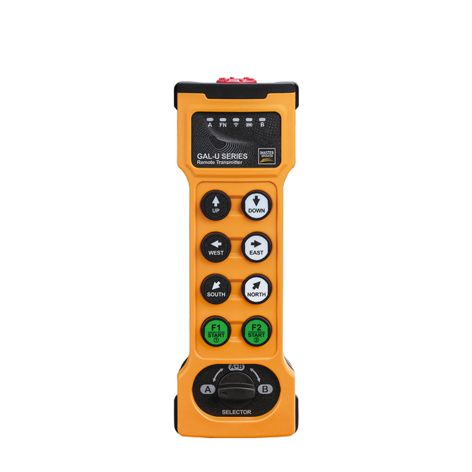 This handheld transmitter is divided into 8-key and 10-key two speed modes to control the corresponding control points. It is equipped with a unique design of a 90 degree directional selection switch, which facilitates the switching and linkage function of the main and auxiliary equipment. It has a mechanical directional selection function.