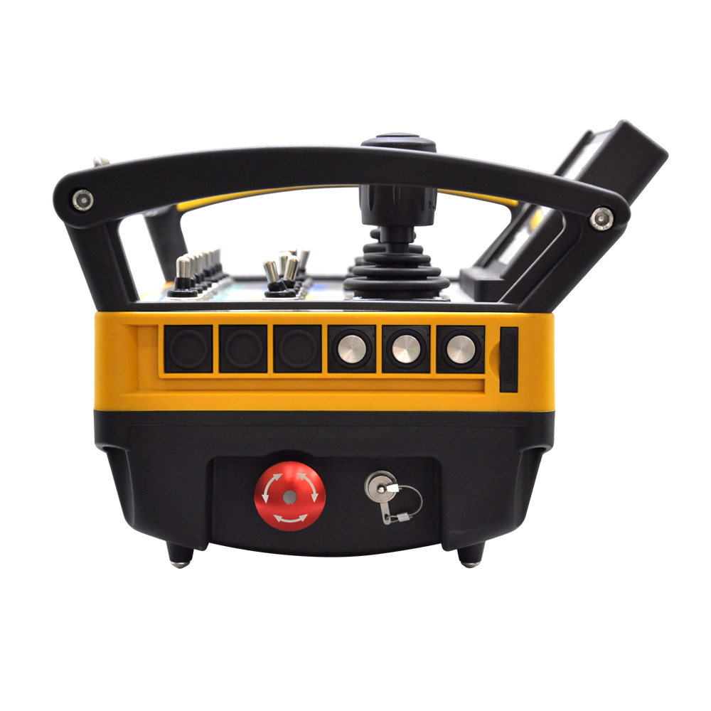 本發射器裝配急停開關,可立刻停止起重機械的所有動作和功能。急停功能符合EN13849:2008cat.3,PL=e標準。
